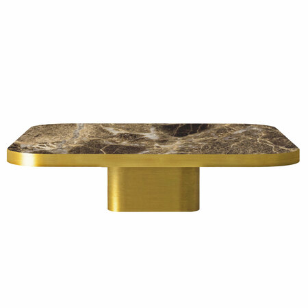 Die mit Glas oder Marmor überzogene Tischplatte schwebt über einer Basis mit abgerundeten Kanten. Die drei Grössen sind so aufeinander abgestimmt, dass die Tische einzeln oder als Gruppe angeordnet werden können – und sich bei überlappenden Tischplatten wie bei einer dynamischen Skulptur eine grosszügige und mehrstufige Ablagefläche ergibt.