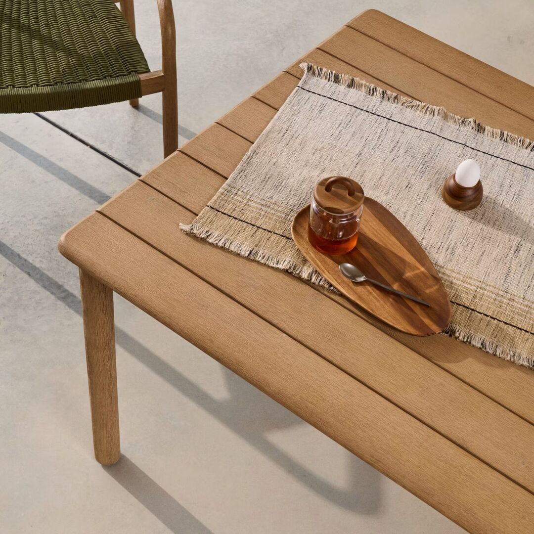 Der Outdoor-Tisch Sori aus massivem Akazienholz vereint Design, Widerstandsfähigkeit und Vielseitigkeit. Das aus gemäß FSC 100 % zertifiziertem Holz gefertigte Modell garantiert eine verantwortungsvolle Waldbewirtschaftung und die kontrollierte Herkunft des Rohstoffs.